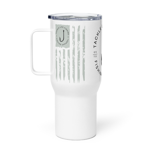 TLF Travel Mug with Handle and Lid -- Flagship Logo and Distressed Flag Design