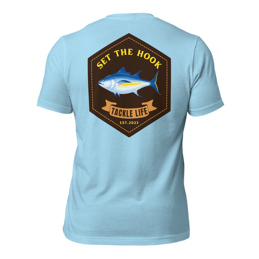 TLF Tuna Patch Unisex T-Shirt with Chest Logo on Yellow, Heather Prism Ice Blue, Ocean Blue, Soft Cream, or White